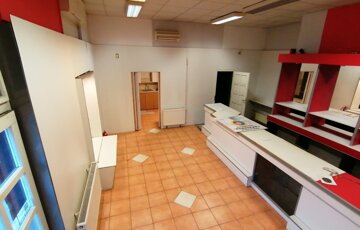 76 m² üzlethelyiség, konyhával, páncélozott helyiséggel, 46 m² száraz, összközműves pincével,